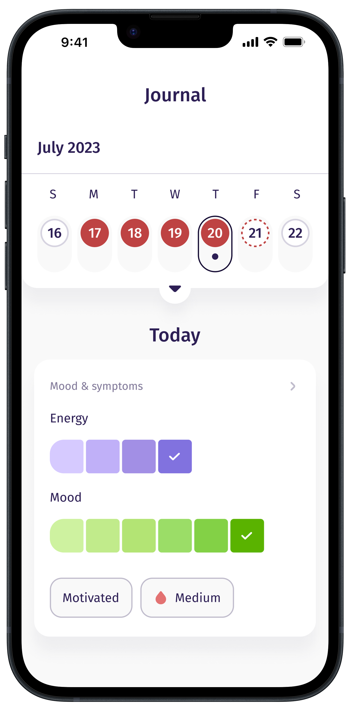 - Elevate your mind-body connection with mood monitoring and menstrual calendar.