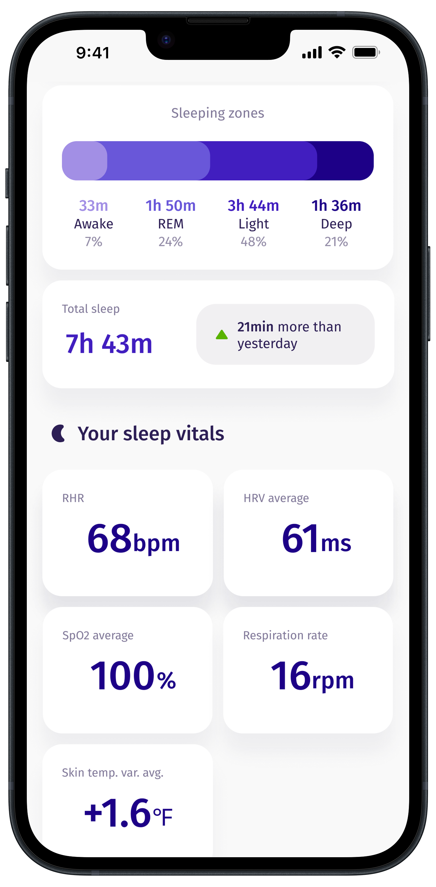 We all dream of a more restful sleep. That’s why Evie uses medical grade sensors to measure key overnight vitals, giving you a clear overview of your sleep zones every morning and providing intelligent insights you can actually use.